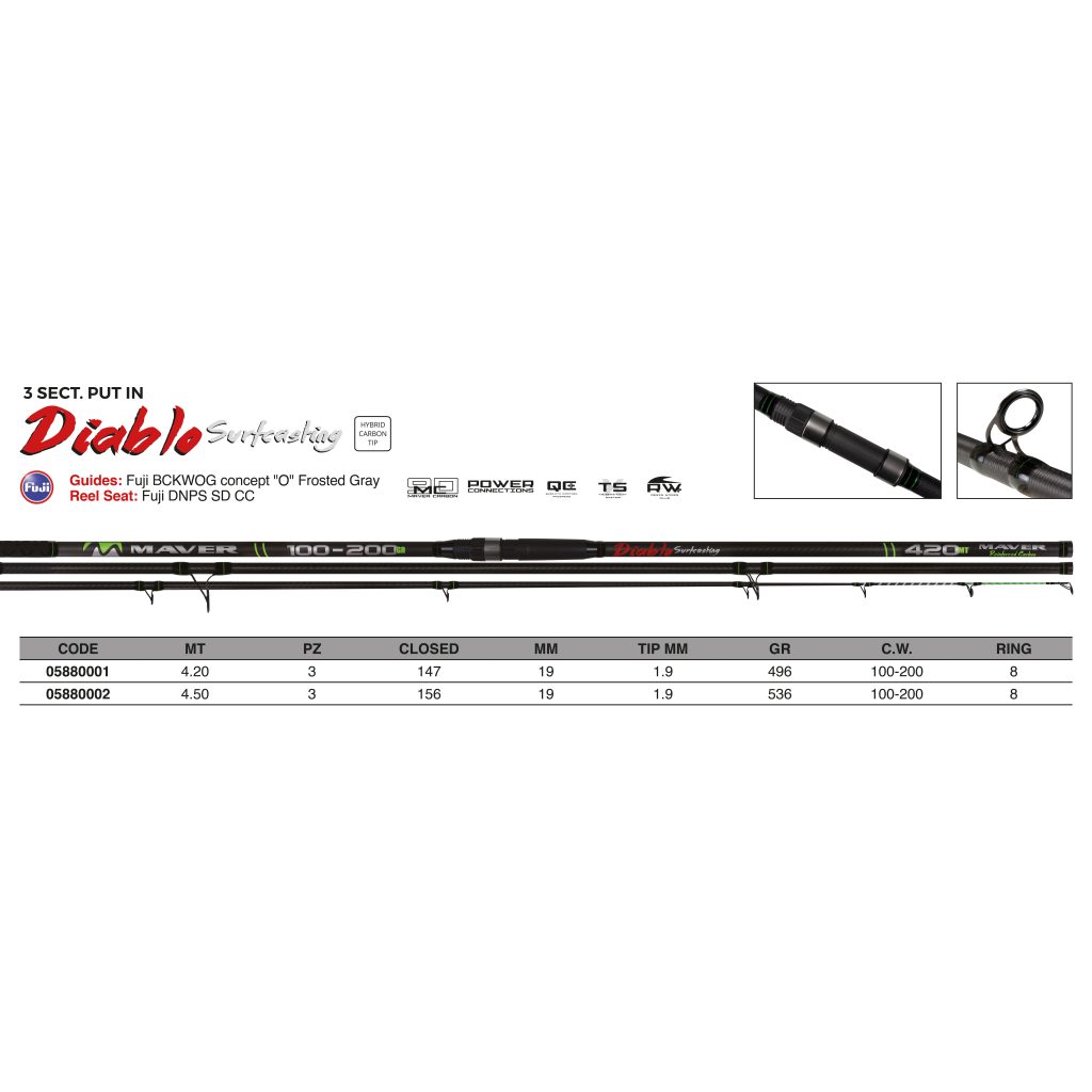 ITA: Pedone in carbonio alto modulo rinforzato a spirale, in grado di accumulare più energia in fase di lancio. Pezzo centrale ad elevata conicità, che permette un rilascio violento della potenza accumulata in fase di caricamento. Cima Hybrid in carbonio pieno, che aiuta a visualizzare le mangiate anche quando peschiamo a notevole distanza ed evita la “spiombata” in caso di mare mosso. Potenza extrema, un concentrato di tecnologia e materiali di altissima qualità, sapientemente distribuiti in maniera progressiva nei tre elementi che la compongono. Disponibile in due lunghezze (4.2 & 4.5 mt) con un range di casting molto ampio (130-250 gr) per adattarsi ad ogni condizione del mare e a svariate tecniche. Anelli e portamulinello Fuji di alta qualità, creati per durare nel tempo!!!